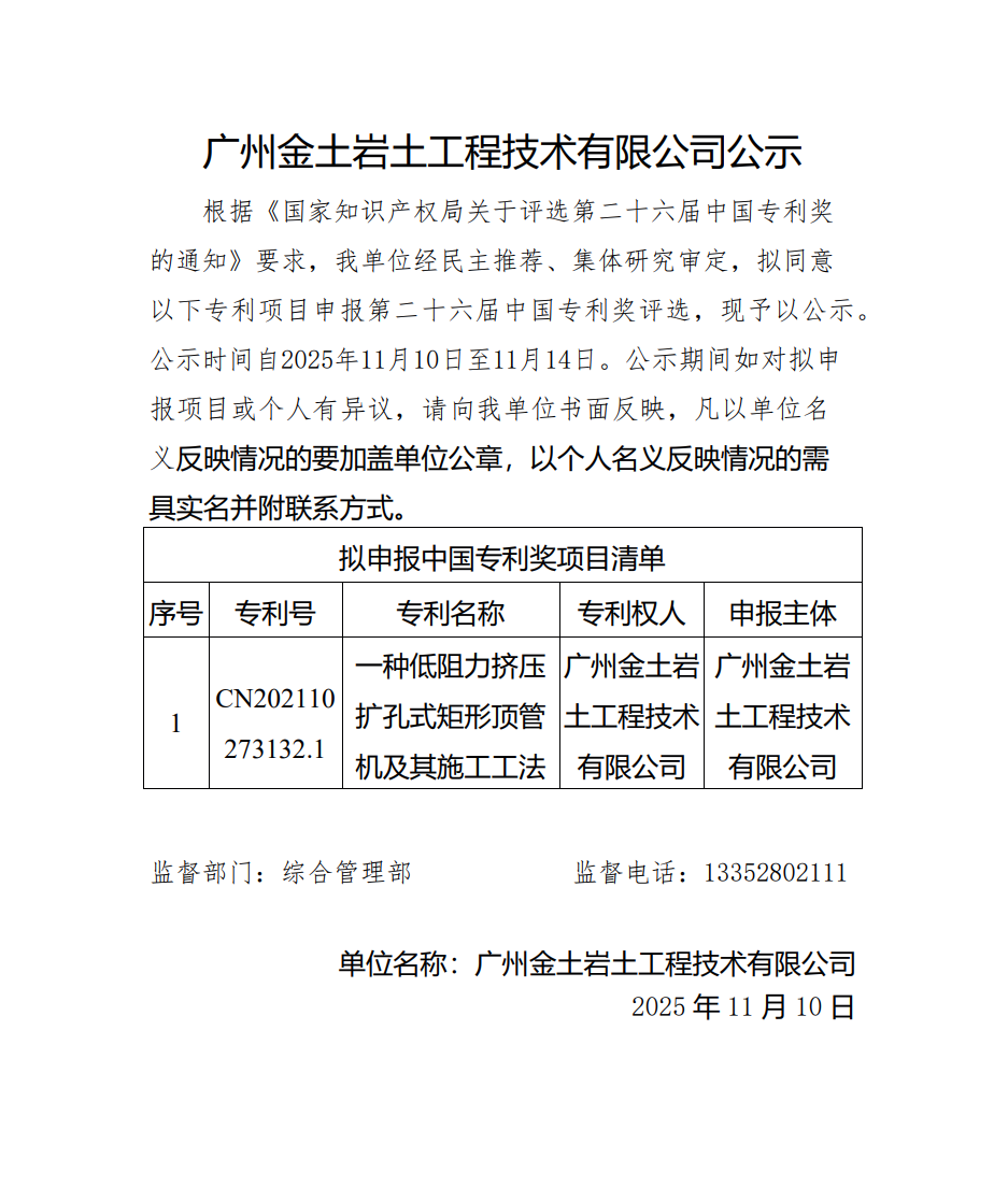 关于申报第二十六届中国专利奖项目的公示